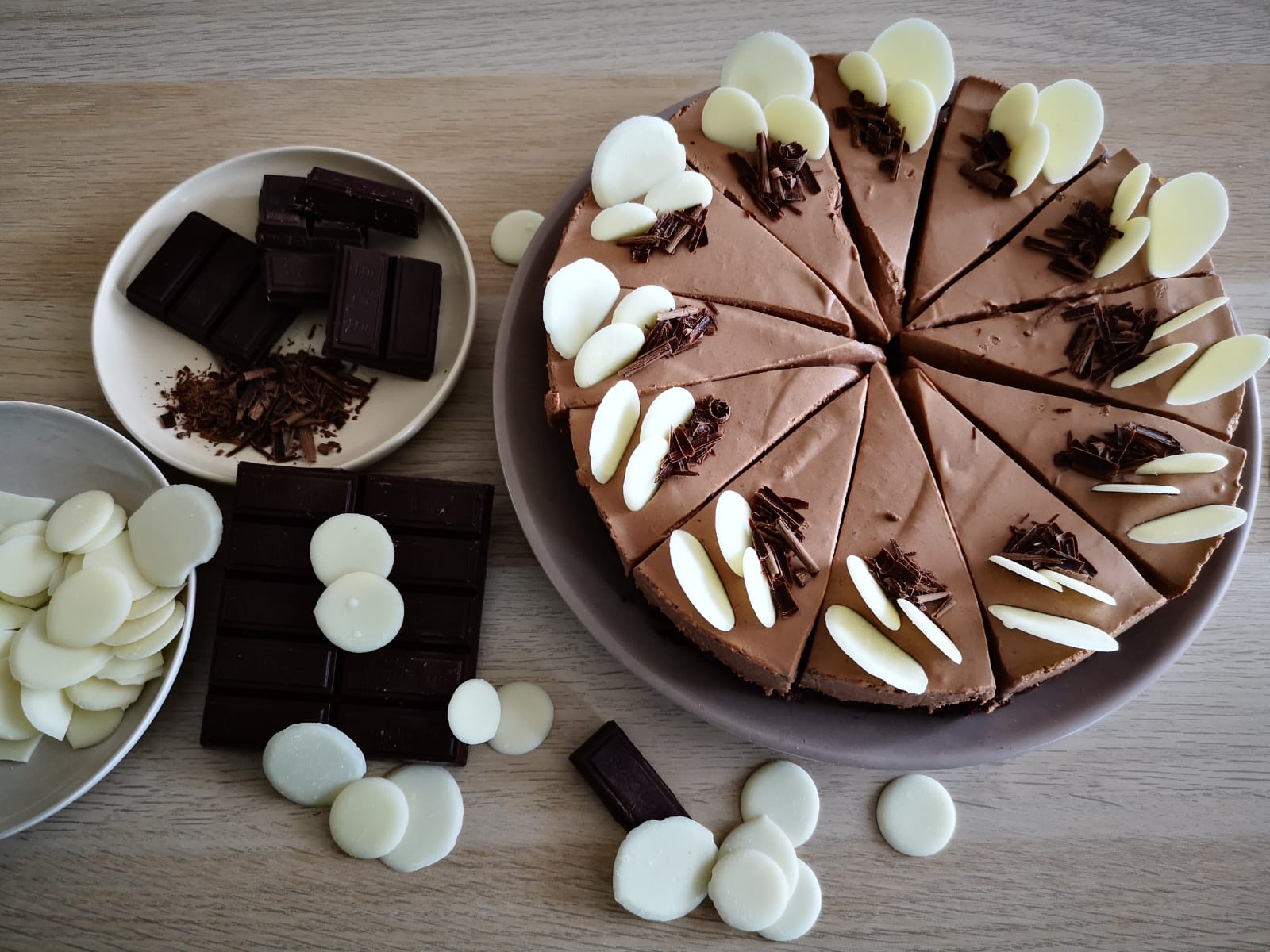 Čokoládovo – tvarohová plnka:Opäť si roztopíme čokoládu vo vodnom kúpeli alebo v mikrovlnke. Vyšľaháme tvaroh so šlahačkovou smotanou, cukrom do tuhého krému. Pridáme postupne čokoládu. Keď budeme mať všetko spojené, namočíme si želatínu na 5 min. do vody. Keď povolí, tak ju vytlačíme z vody a pomaly zohrejeme v hrnci. Nesmie nám vrieť, lebo stratí svoju vlastnosť tuhnutia. Rozpustí sa a vleje do čokoládo – tvarohovej plnky a všetko sa vymieša. Nalejeme na korpus a zarovnáme. Nechá sa zatuhnúť do druhého dňa. Zatuhnutú tortu nakrájame, dozdobíme bielou čokoládou a čokoládovými hoblinkami.