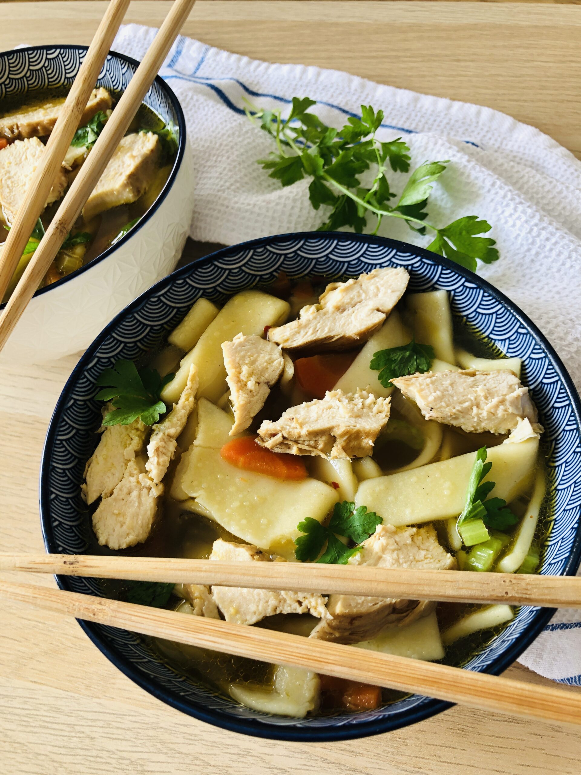 Kurča si umyjeme pod vodou a vysušíme, rozoberieme na časti. Vykrojíme kuracie prsia, oddelíme stehná od kurčaťa a vykostíme. Pripravíme si plech s papierom na pečenie. Položíme kostru z kurčaťa a kosti zo stehna. Pretrieme ich olejom a trošku osolíme. Ku kostiam si dáme odrezaný spodok zo stonkového zeleru a jednu – dve stonky zeleru. 4 očistené mrkvy, 2 umyté cibule aj so šupkou a cesnak. Dáme všetko piecť na cca 45 min., kým kura trošku nezhnedne. Je to dobré urobiť preto, aby sme nemuseli potom zbierať penu z vývaru. Kým sa nám kosti pečú, pripravíme si studenú vodu. Dáme do nej soľ, čierne korenie, bobkový list, stonky z vňaťky. Umytý pór a vňaťku si nakrájame na jemno, použijeme potom na zdobenie. Keď máme kosti upečené, pridáme ich do hrnca s vodou a dáme variť na 45 min. Medzitým vývar ochutnáme a dochutíme soľou a korením. Nakrájame si dve cibule, očistíme štyri mrkvy očistíme a nakrájame na polkruhy. Stonkový zeler si narežeme na konci a snažíme sa z neho vytiahnuť vlasy. Potom bude chutnejší. Nakrájame na polkruhy. Do ďalšieho hrnca si dáme variť cestoviny. Zoberieme si ešte jeden hrniec. Stiahneme stehná a prsia z kože a pridáme do vývaru. Opečieme stehná aj prsia z obidvoch strán do zlatista na oleji, opečené vyberieme. Pridáme maslo a necháme opiecť do hneda. Pridáme zeleninu, ktorú sme si nakrájali, trochu ju orestujeme. Zalejeme vývarom. Pridáme kuracie mäso. Necháme polievku variť, kým mäso nie je mäkké a ochutnávame, dochucujeme podľa našich predstáv. Keď máme kuraciu polievku uvarenú, naberieme do misiek, pridáme cestoviny. Môžete pridať aj viac cestovín, ak máte radi hustú polievku, ako my. Určite vás potom zasýti na dlhší čas.